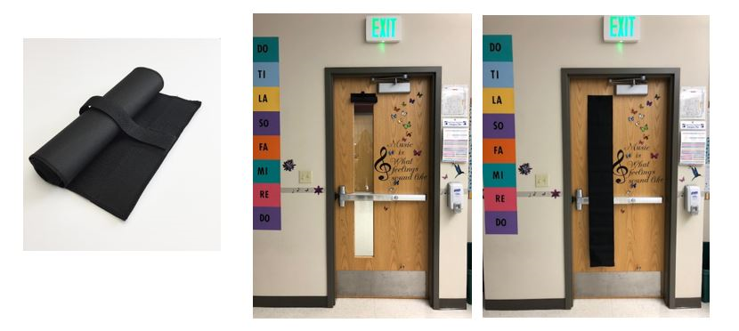 The Lockdown Blackout Shades are custom made to fit the various sizes of our interior classroom door windows. They are fire retardant and easy to deploy. They stay in the up (open) position except during a Code Red Lockdown. Our school district Facilities & Maintenance team does the installation.