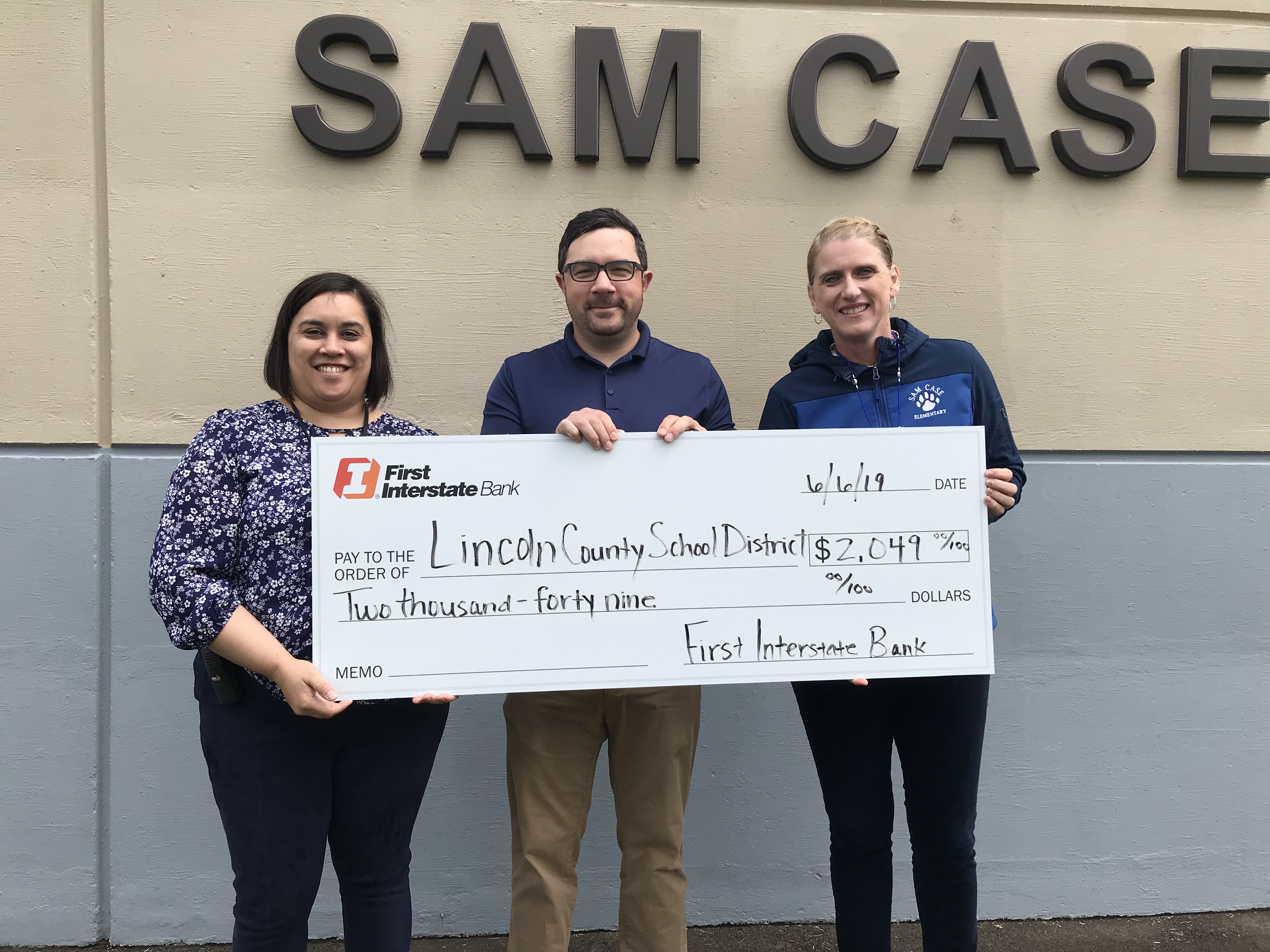 - Check presented to Shelley Moore, principal of Sam Case, Trevor Brittsan of First Interstate Bank, and Kristin Becker, principal of Yaquina View. Standing in front of classroom in need of shades at Sam Case.