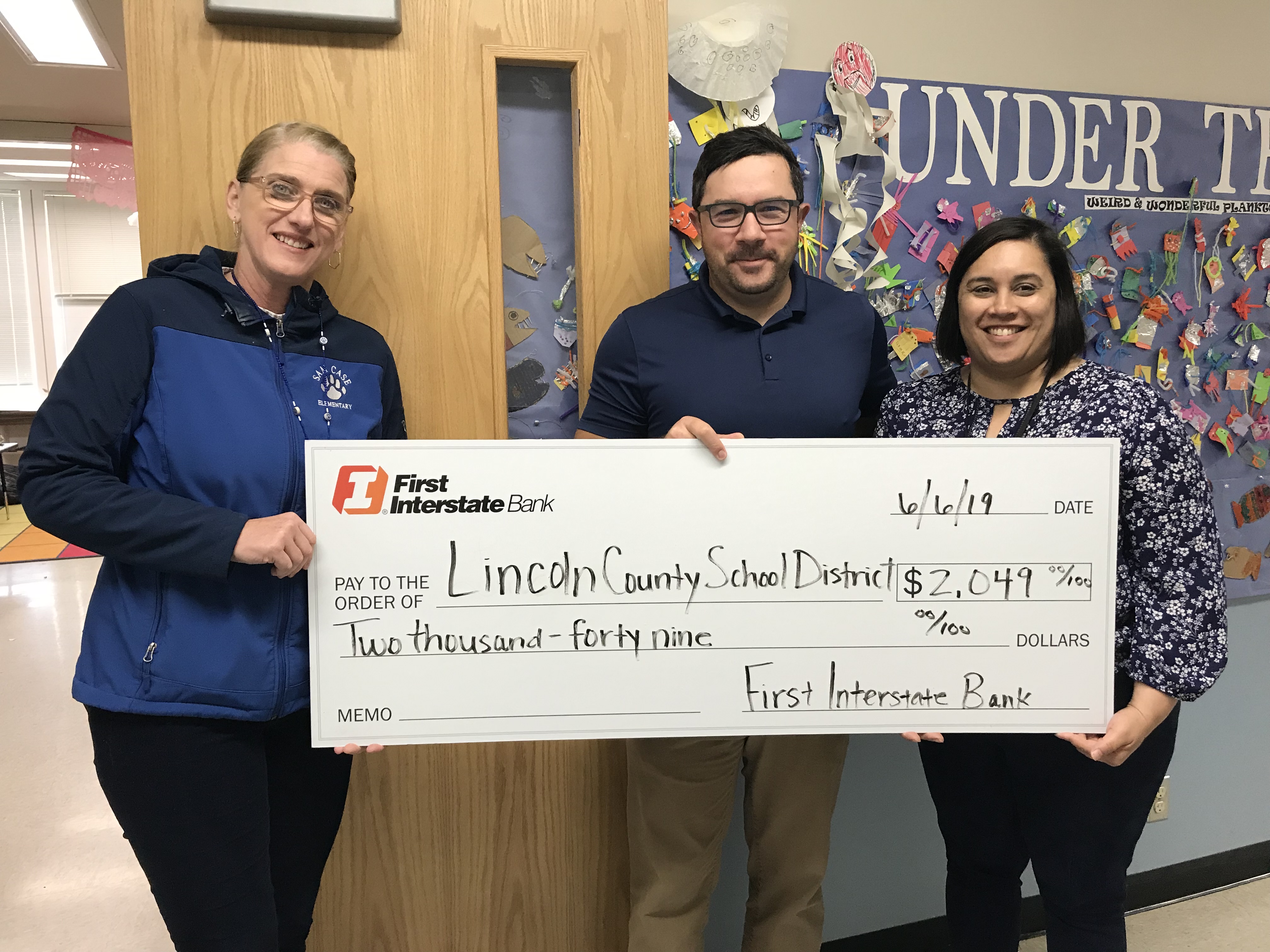 Trevor Brittsan, Gerente de la Sucursal del Banco First Interstate de Newport, presentó un cheque por $ 2,409 al Distrito Escolar del Condado Lincoln para comprar Cortinas de seguridad para las escuelas primarias Sam Case y Yaquina View en Newport. La directora de Sam Case, Shelley Moore y la directora de Yaquina View, Kristin Becker, se reunieron con el Sr. Brittsan en Sam Case para recibir el cheque y mostrarle al Sr. Brittsan uno de los salones de clase que necesita una cortina de seguridad.