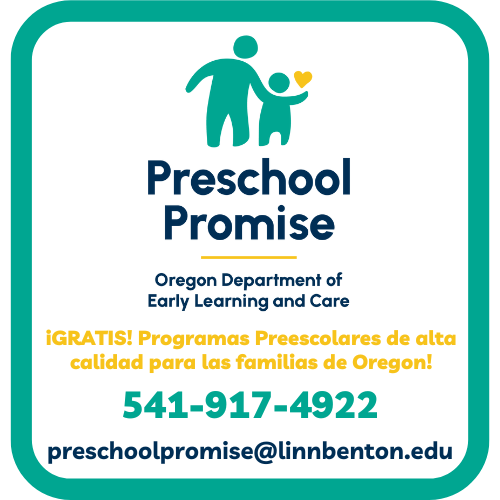 Prepare a sus pequeños para el kindergarten y una vida de aprendizaje con una experiencia de preescolar de calidad y gratuita, que se adapte a las necesidades y estilo de aprendizaje de su niño. ¡La solicitud de Preschool Promise 2024-25 está abierta! Si usted vive en Oregon y tiene un hijo/a entre 3-5 años de edad y cumple con los requisitos de ingresos ¡Usted podría calificar para preescolar gratuito! https://lfforms.linnbenton.edu/Forms/PSP24-25