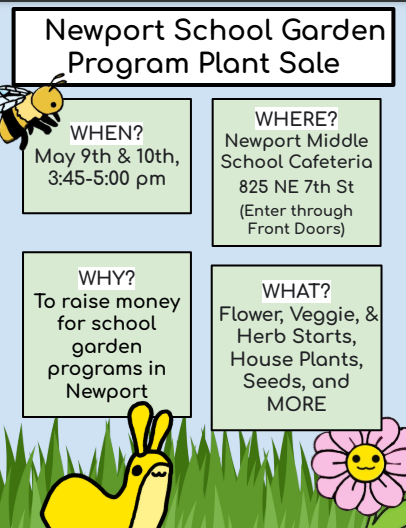 Newport Schools are hosting their annual plant sale this week. Stop by Newport Middle School, 825 NE 7th St., on May 9 and 10 from 3:45 to 5 p.m. Flowers, veggie and herb starts, house plants, seeds and more will be available in the cafeteria. All proceeds with go to the school garden programs in Newport.