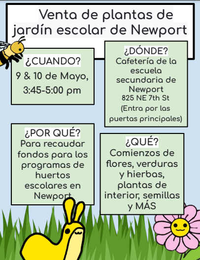 Las escuelas de Newport están organizando su venta anual de plantas esta semana. Pase por Newport Middle School, 825 NE 7th St., el 9 y 10 de mayo de 3:45 a 5 p.m. Flores, vegetales y hierbas, plantas de interior, semillas y más estarán disponibles en la cafetería. Todo lo recaudado se destinará a los programas de huertos escolares de Newport.