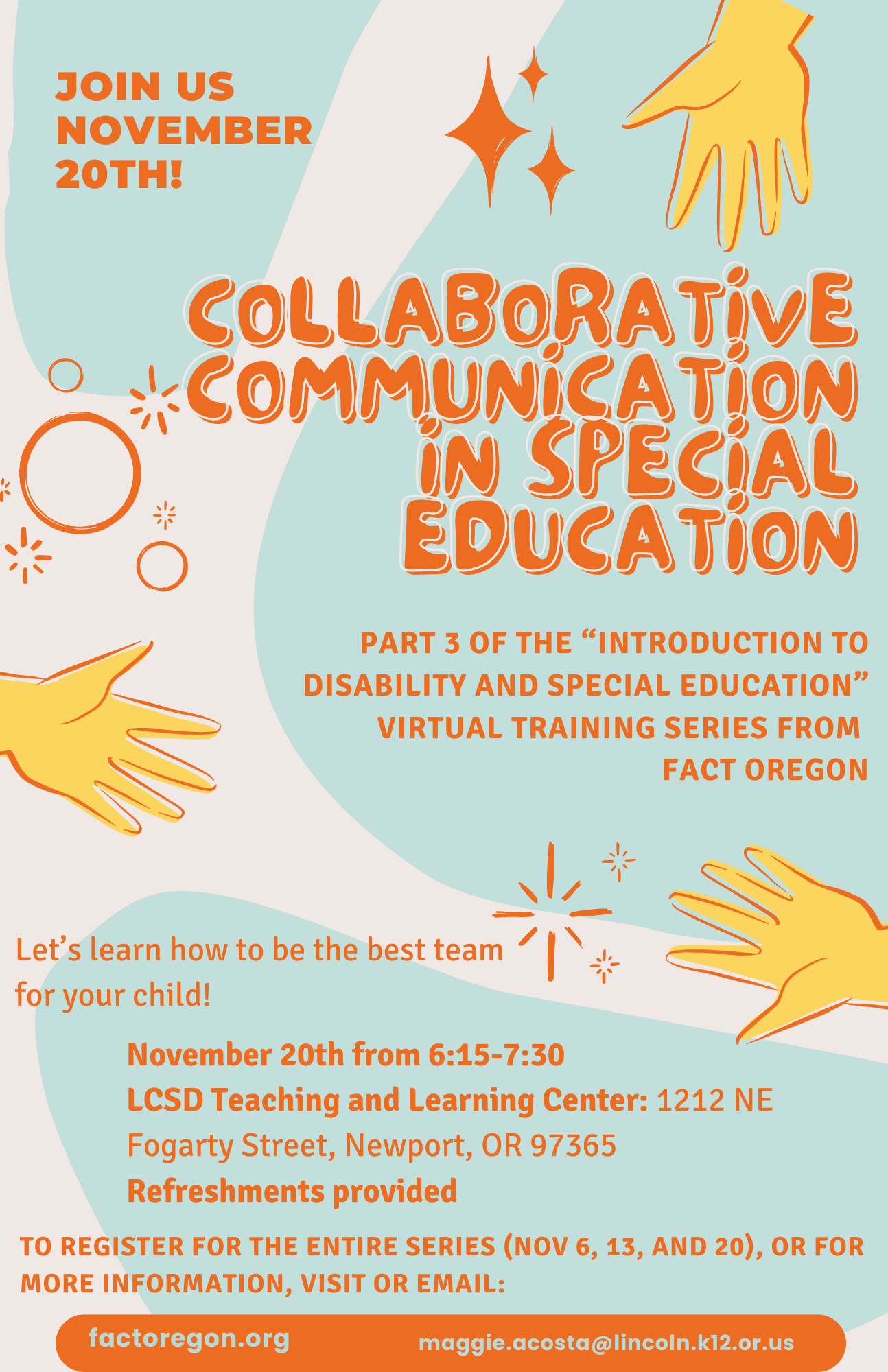 Lincoln County School District is hosting Part 3 of the “Introduction to Disability and Special Education” virtual training series from Fact Oregon on November 20 from 6:15-7:30 p.m. at the Teaching and Learning Center, 1212 NE Fogarty St., Newport. Refreshments will be served.