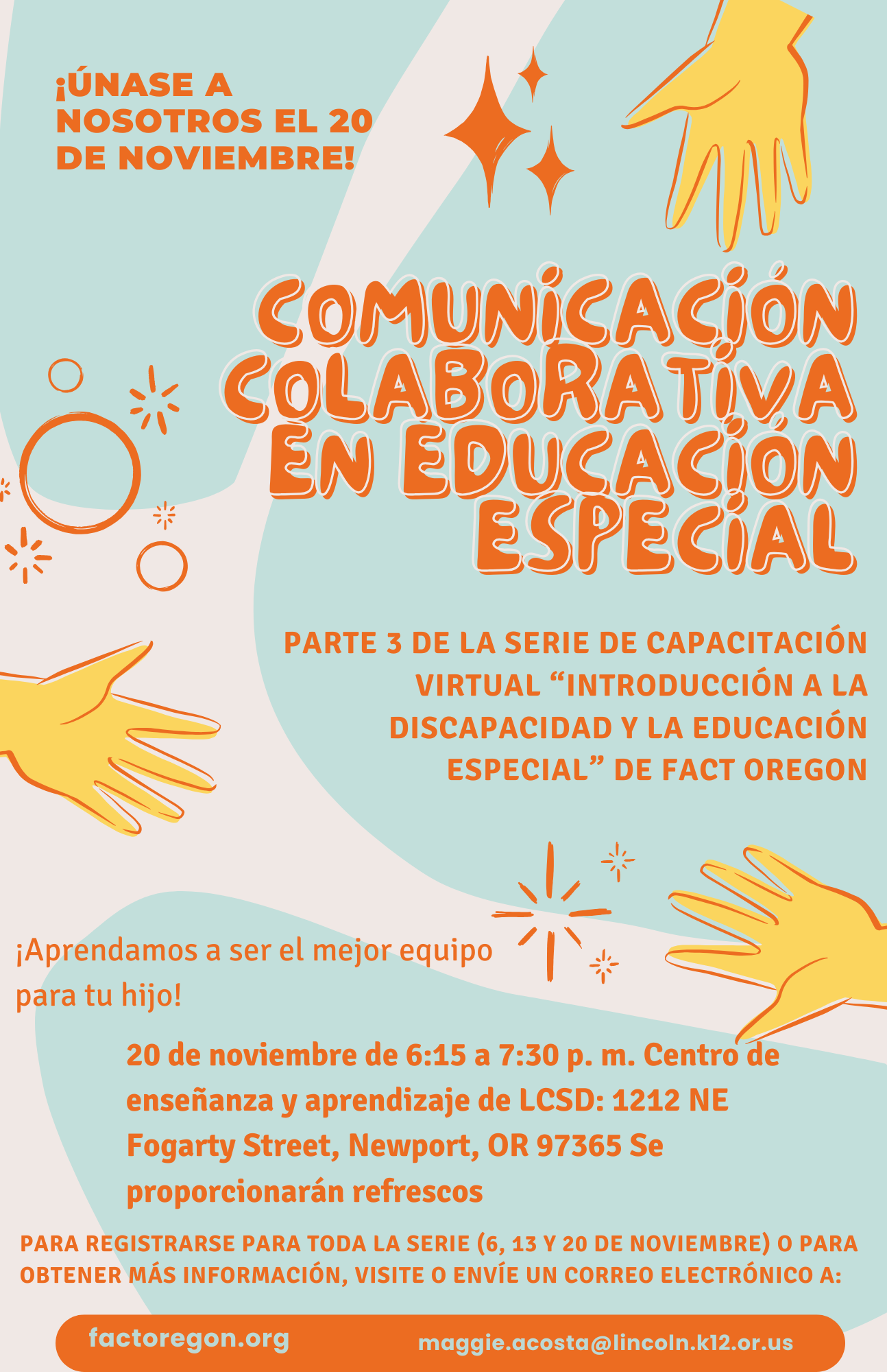 El Distrito Escolar del Condado de Lincoln está organizando la Parte 3 de la serie de entrenamiento virtual «Introducción a la Discapacidad y Educación Especial» de Fact Oregon el 20 de noviembre de 6:15-7:30 p.m. en el Centro de Enseñanza y Aprendizaje, 1212 NE Fogarty St., Newport. Se servirán refrescos.