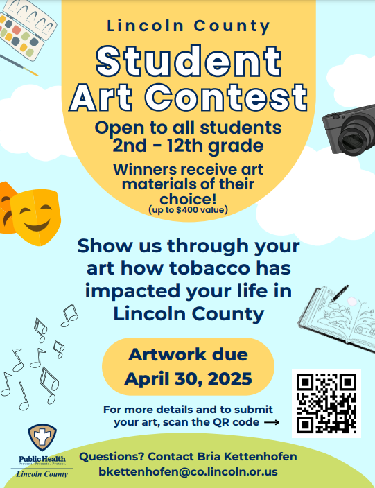 Winners received art materials of their choice valued at $400. For more information, scan the QR code or email Bria at bkettenhofen@co.lincoln.or.us.