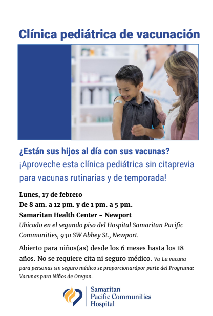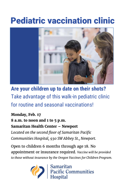 This information is shared on behalf of a partner organization. Samaritan Pacific Communities Hospital is hosting a pediatric vaccination clinic on Monday, February 17, 2025 from 8 a.m. to noon and 1 to 5 p.m. at the Samaritan Health Center in Newport (located on the second floor of Samaritan Communities Hospital, 930 SW Abbey St., Newport). The routine and seasonal vaccination clinic is open to children 6 months through age 18. Vaccines will be provided to those without insurance by the Oregon Vaccines for Children Program.