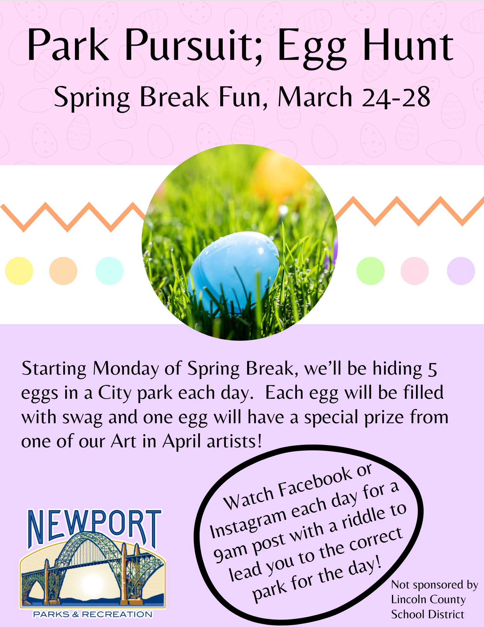This information is shared on behalf of the Newport Rec Center. During Spring break starting Monday, March 24 and running through Friday, March 28, five eggs will be hidden in a Newport City park. Each egg will be filled with swag and one egg will contain a special prize from an Art in April artist! Follow the Rec Center on Facebook and Instagram for a 9 a.m. post with a riddle each morning that will lead you to the correct park for the day. Find out more information at www.newportoregon.gov/dept/par/rec/. This event is not sponsored by Lincoln County School District.
