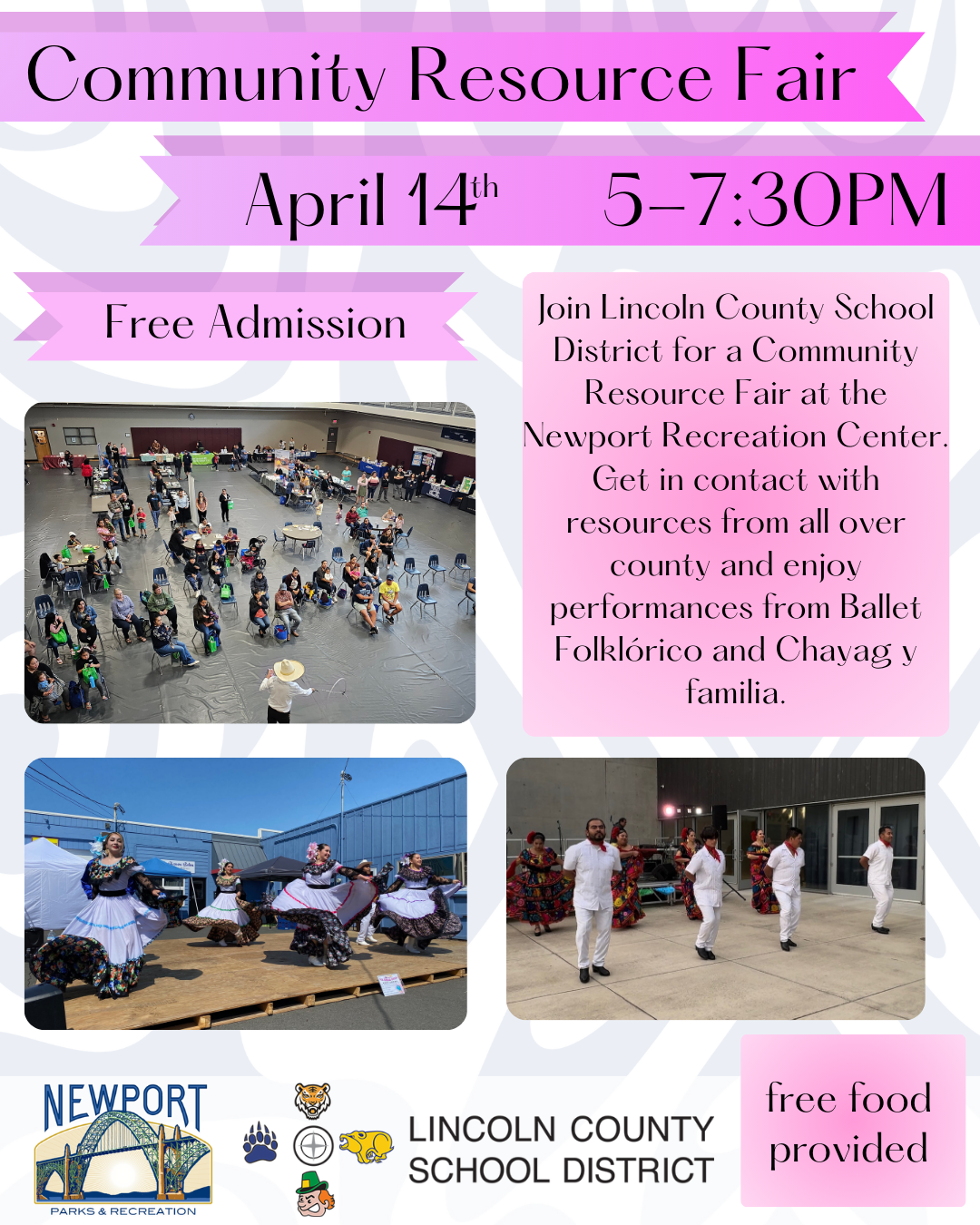 Únase a LCSD para una Feria de Recursos Comunitarios en el Centro de Recreación de Newport el lunes 14 de abril de 5-7:30 p.m. Este evento comunitario bilingüe ofrecerá información sobre valiosos servicios y programas disponibles para los residentes del Condado de Lincoln. Una cena gratis será proporcionada y Ballet Folklórico y Chayag y familia actuarán. ¡Esperamos verlos allí!