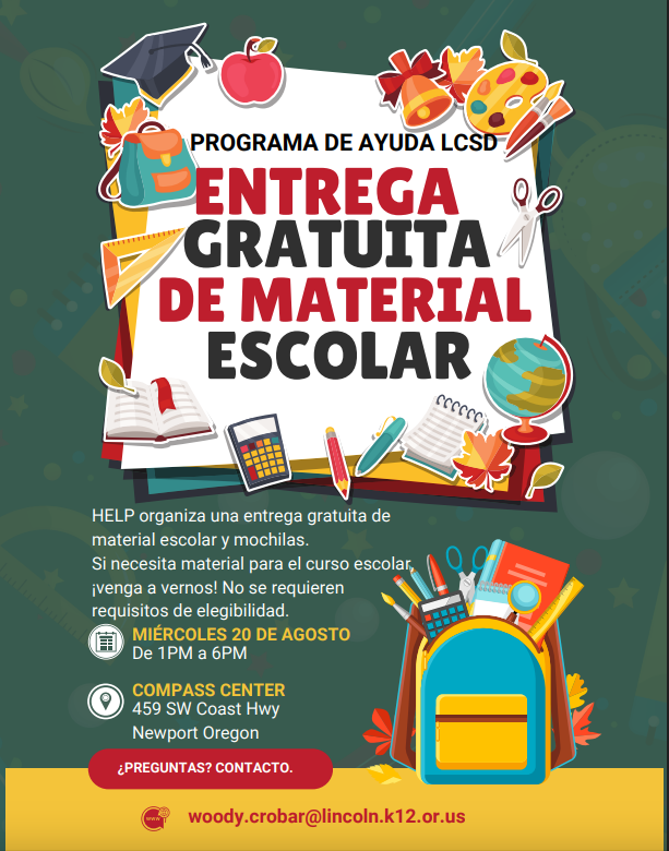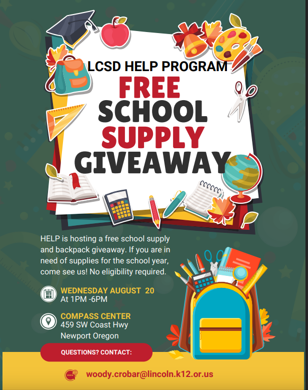 LCSD’s HELP program is once again hosting a free school supply and backpack giveaway! Stop by the Compass Center, 459 SW Coast Highway, Newport on August 20, 2025 between 1-6 p.m. No eligibility is required. For more information, email woody.crobar@lincoln.k12.or.us.